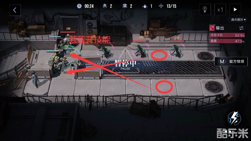 蔻蔻处理完面前的敌人后挪到卡瓦卡瓦上面挡住敌人,并且开启蔻蔻技能。然后给卡瓦卡瓦冲能一次。