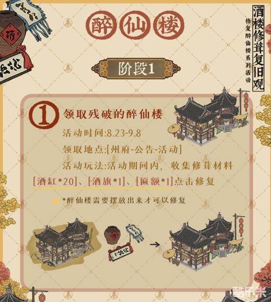 注意:醉仙楼需要摆放出来才可以修复