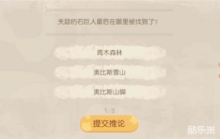 解析:根据和弗里奇对话可以知道是在山洞中将石巨人解救出来,并且是在黑创造师之前的实验室,这个位置在上一案中就已经揭晓,那就是在奥比斯雪山。