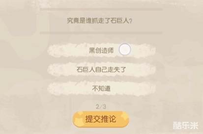 解析:这个问题的答案很简单,首先选项③就是凑数的,那么根据我们收集到的线索和证词可以明确知道石巨人是被带走的不是自己走失了,所以②选项也不对,那么只能选择①黑创造师了。