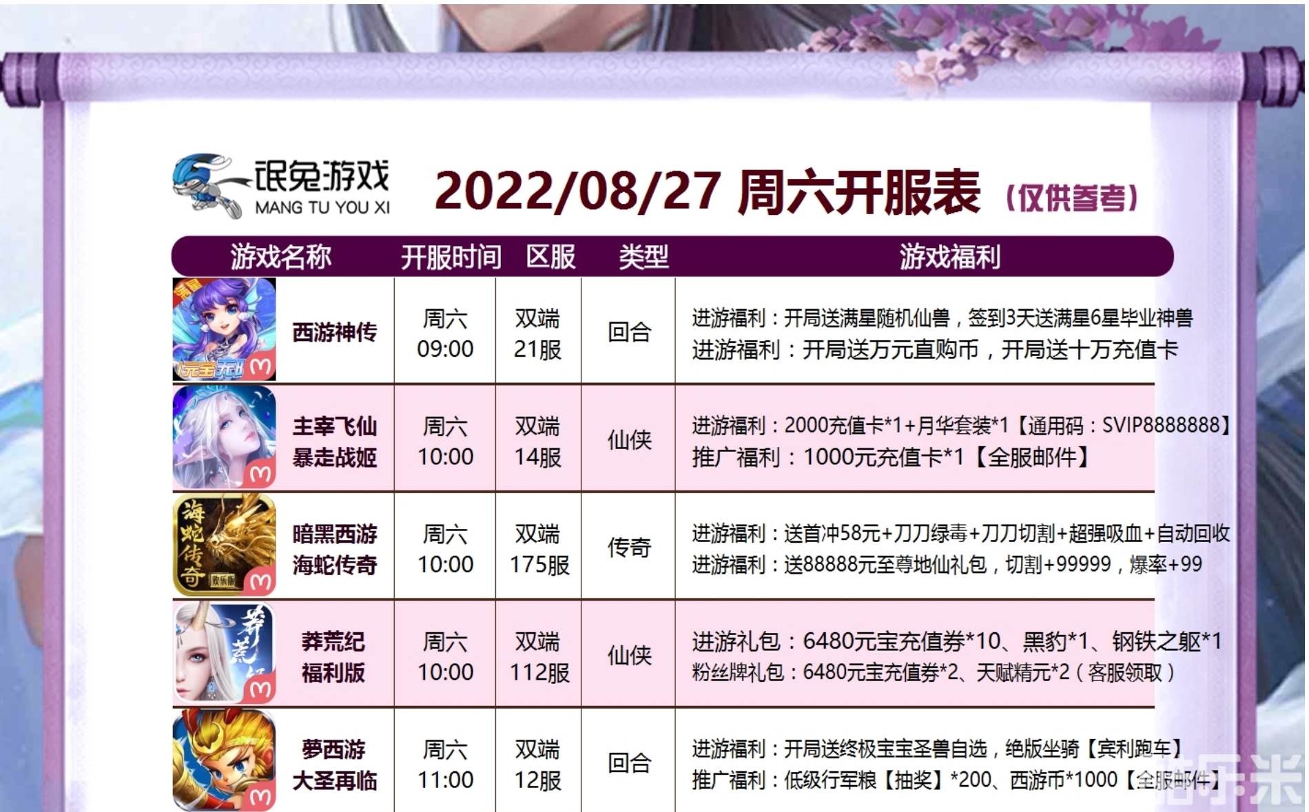 | 莽荒纪-福利版 | 112区( 苹果- 安卓) | 2022-08-27 10:00:00 |