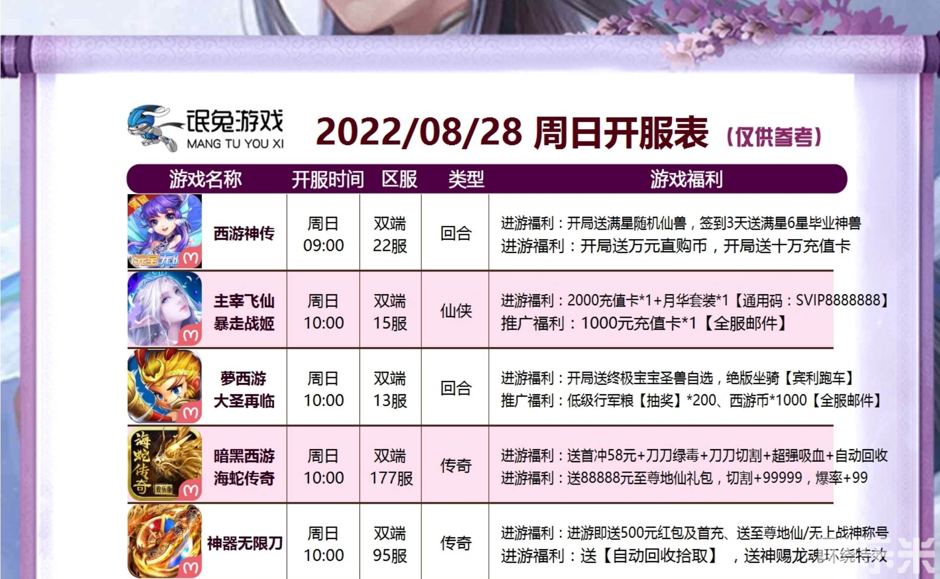 | 西游神传-送毕业神兽 | 22区( 苹果- 安卓) | 2022-08-28 09:00:00 |
