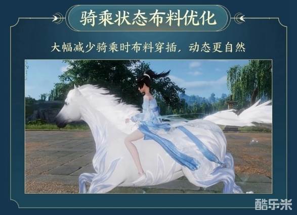 另外,骑马时的布料效果也得到了优化,大大减少了骑马时出现布料穿插的尴尬情况。后续,不论是骑马待机、行走、跑动,骑行的侠士衣着布料表现都会更符合动力学,且层次也更拟真,减少违和感。