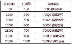【活动内容】活动期间可通过充值金币获得好运值,积累好运值即可打开宝箱奖励,超多的徽章碎片,徽章等级不断攀升,绝对超值的提升战力资源,尽在特惠好礼。