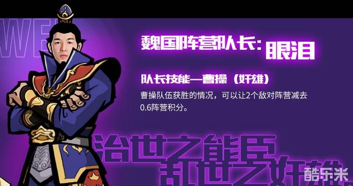 奸雄技能可以在队伍获胜的情况下,让2个敌对阵营减去0.6阵营积分。此AOE技能给到队长眼泪最好,赢下比赛可以减少两个阵营的积分,如此关键的技能运用得当的话可以打出成吨的伤害。
