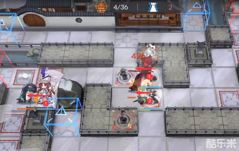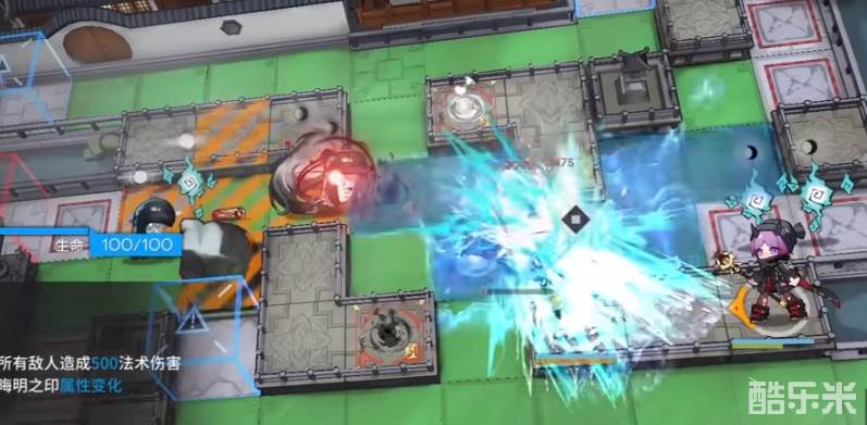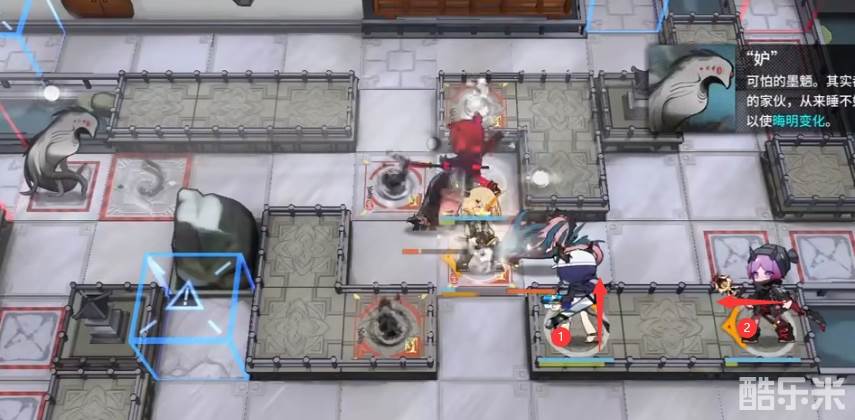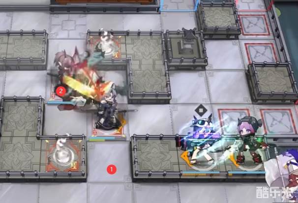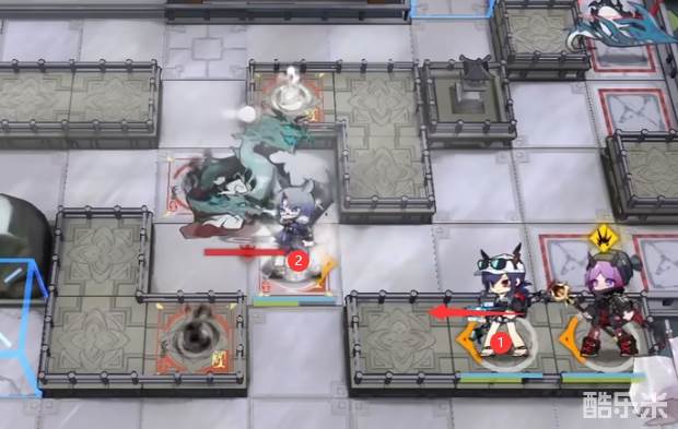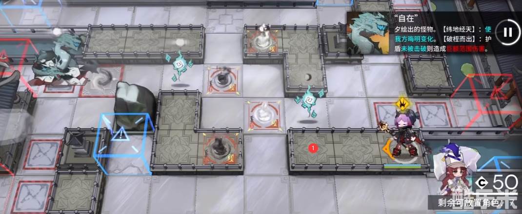 6.BOSS在左边的变幻格时1号位用夜刀卡一下,让他多变一次变成白色。然后2号位下先锋卡出盾。