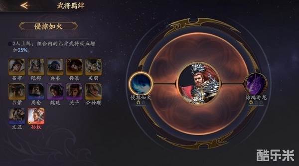 4.孙权作为近战输出武将,除了这种搭配外,搭配其他攻击类武将组成"侵掠如火"羁绊,也能够获得较高的吸血属性,续航的同时还可以进行输出!