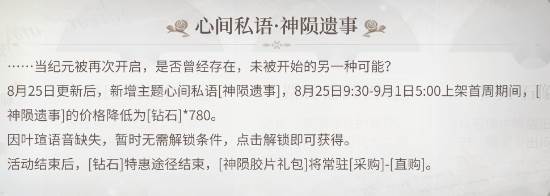 8月25日更新后,新增主题心间私语[神陨遗事],8月25日9:30-9月1日5:00上架首周期间,[神陨遗事]的价格降低为[钻石]*780。