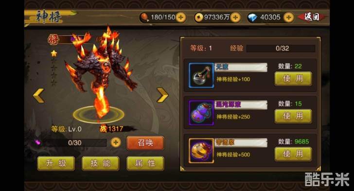 神将如此重要,要强力,可是需要收集并成长的。最简单的成长方式,当然是吞噬经验道具提升神将等级了。神将等级越高,神将的自身属性自然越强。神将的升级材料,在日常玩法中即可获取。