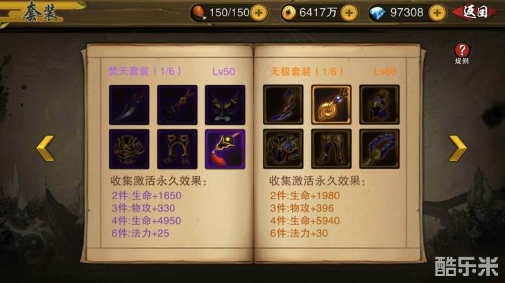 除了具备常规的装备加工属性外,装备还具备各种套装效果。收集指定的套装数量,即可激活套装属性。集齐完整的一套套装,激活完整的套装属性,战斗中将如虎添翼,大大降低战斗难度。