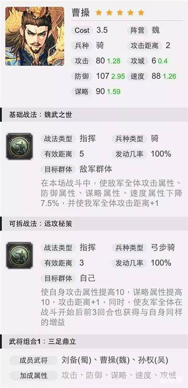 再来说下搭配方面,毫无疑问曹操是做前锋的,由于技能既有万金油的属性部分,又有加攻击距离的辅助部分,所以搭配魏骑或者是搭配菜刀都是不错的选择,战法方面最常见的就是战必断金+反计之策,其他可以考虑的包括一夫当关这样的拉仇恨,或者擅兵不寡/青囊秘要这样的回血技能,三围好的武将,玩法会非常多,带什么都不吃亏。