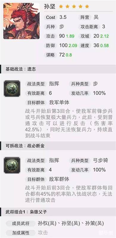 另外由于技能本身是针对前锋位而非固定某个人,因此拿一个同样高攻防的将做前锋,然后让孙坚在中军做辅助也是一种思路。这里提醒一下,这个技能只针对步兵和弓兵有效。
