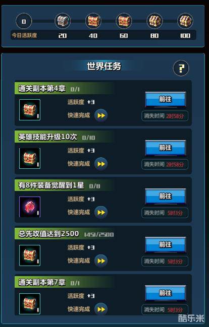 每日活跃:每个任务都有相对应的活跃度,品质越高活跃度越高