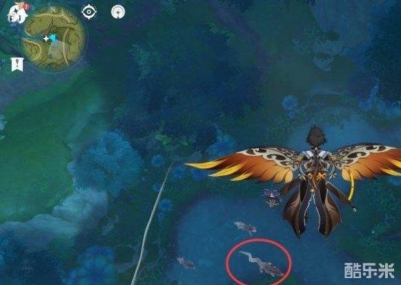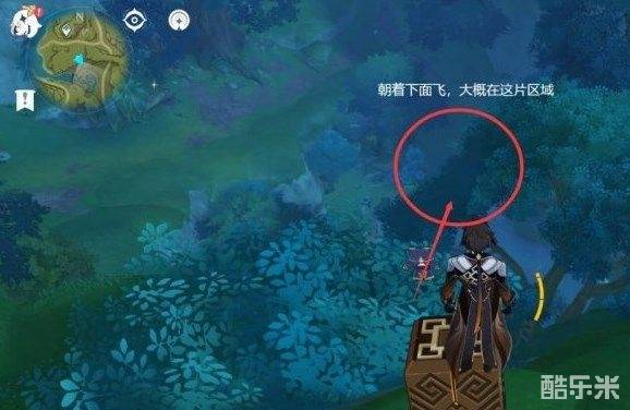 来到坡这里,继续朝着地图东南方向看。第一个凶猛动物就在这我画的地方。飞过面前的树,降点高度就能看见了。