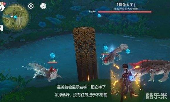 把高度降低就能发现在水池旁边有一只很胖的鳄鱼,靠近它就会显示名字。把它宰了就好,没有任务提示不用管。