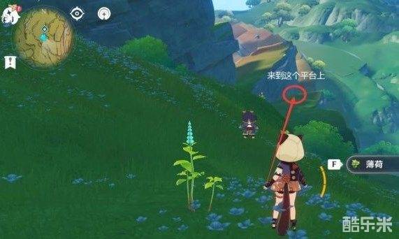 绕过山之后,右手边有一朵薄荷,站在薄荷的位置朝着地图东南方向看。在那个巨大斜坡的右边有个平台,往那里走。