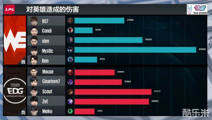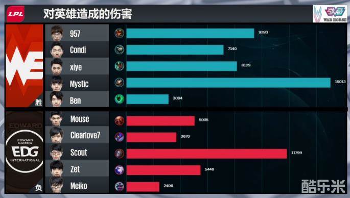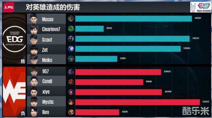 最终,EDG破掉WE下路高地瞬间的开团直接将WE四人击杀,成功拿到了首局比赛的胜利!