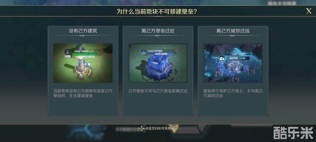 【壁垒】可以修建在己方已有指挥所的地块连接处,但需要领主大大注意的是,修建的【壁垒】不可以距离我方最近城池太远,也不可以距离敌方城池太近。另外【壁垒】与堡垒的修建位置,也有一定的距离要求。