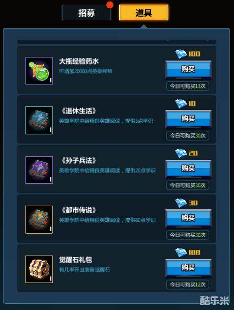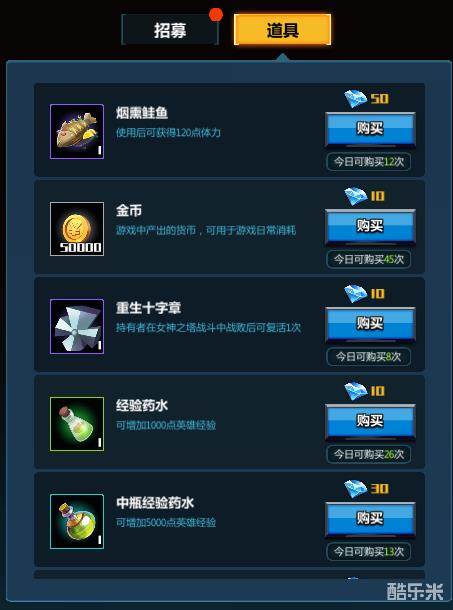 可以看到购买列表还是蛮丰富,包含体力、金币、重生十字章、经验药水、英雄学院道具、觉醒石宝箱,一些道具有每日购买的限制,达到购买上限后今天就不能购买了。