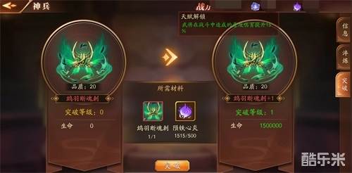 神兵获取后可以不断养成,提升属性。通过消耗墨金之魂可以对神兵进行淬炼,增强神兵属性,当属性淬炼满值后,还可以进行突破升阶,解锁更高等级的属性淬炼。红色品质神兵突破升阶后将获得天赋解锁,与该神兵有羁绊的武将穿戴后,可获得天赋加成,为少主带来不容忽视的战场助力。