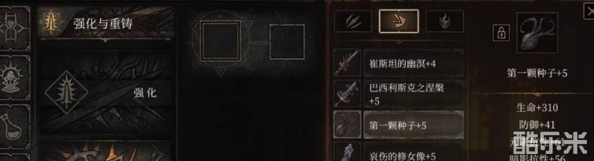 第一课种子的属性是生命增加310点,防御增加41点,元素抗性增加61点,重铸属性是暗影抗性增加56点,装备所附带的特殊效果是暴击时回复大量精力。该装备是击败第七章boss篡位者时概率获得。