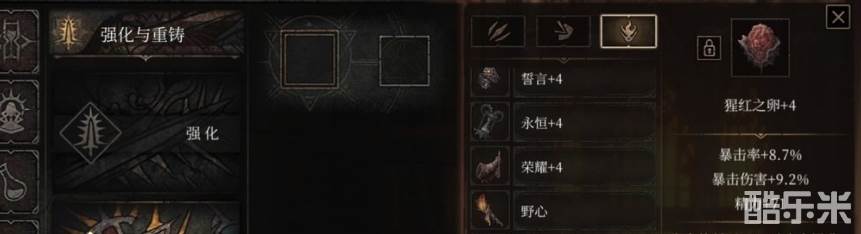 猩红之卵在前期是一件不错的输出装,其属性为暴击率增加8.7%,暴击伤害增加9.2%,重铸属性为精力增加71点,装备的特殊效果是生命值低于50%时提升攻击。