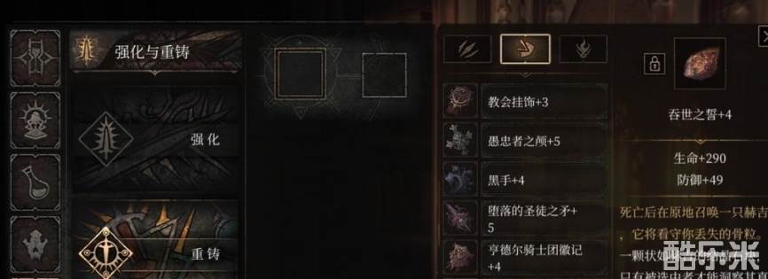 吞世之誓的属性是生命增加290点,防御增加49点,装备所附带的特殊效果是死亡后召唤一只赫吉帮你看守丢失的骨粒。