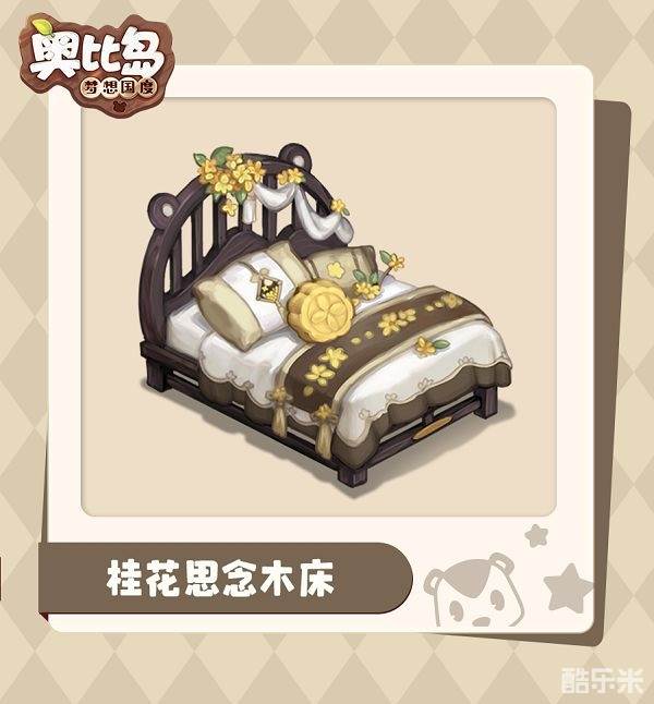 用檀木雕成的熊耳木床上置着一只月饼抱枕,娇嫩金黄的月桂花团点缀床头,让小床更加香甜柔软。