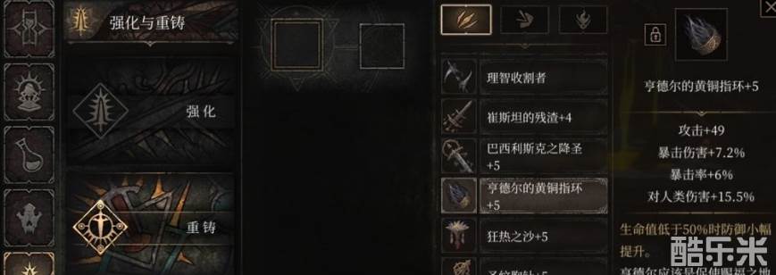 亨德尔的黄铜指环的属性是攻击增加49点,暴击伤害增加7.2%,暴击率增加6%,重铸属性为对人类伤害增加15.5%,装备所附带的特殊效果是生命值低于50%时防御小幅提升。