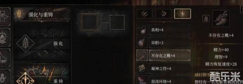 不存在之靴的属性是精力增加40点,理智增加9点,精力恢复速度增加28点,装备所附带的特殊效果是减轻脚步声。