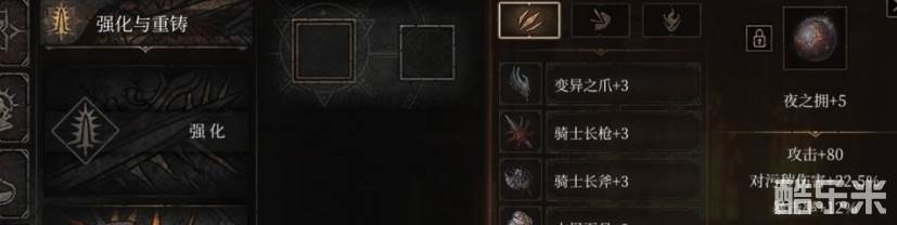 夜之拥的属性是攻击增加80点,对污秽伤害增加22.5%,重铸属性是暴击率增加12%,装备附带的特殊效果是杰罗尔德对敌人施加标记时,可将该敌人转化为污秽类敌人。
