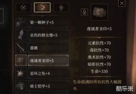 虔诚者圣印的属性是增加70点元素抗性、70点毒抗性、70点奥术抗性和70点暗影抗性,重铸属性是生命增加330点,装备所附加的特殊效果是生命值满时所有抗性大幅提升。