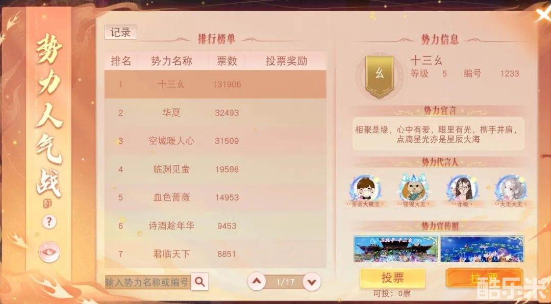 同时,也很高兴十三幺获得了势力人气榜的榜首,感谢势力小伙伴的齐心协力努力贡献,特别是丢丢、星哥、仙子、千骨、北妞买了好多拉票箱子,同时也很感谢所有为十三幺投上一票的其他势力朋友。我认为十三幺最大的魅力是团结、有爱、有活力和激情~无论是下本,打架还是这些battle类的活动,大家都很团结和积极。