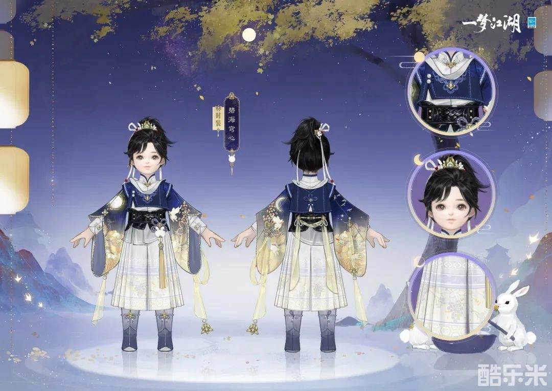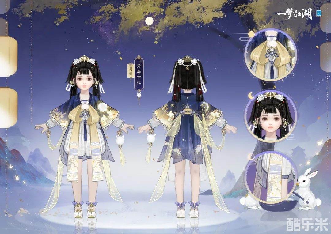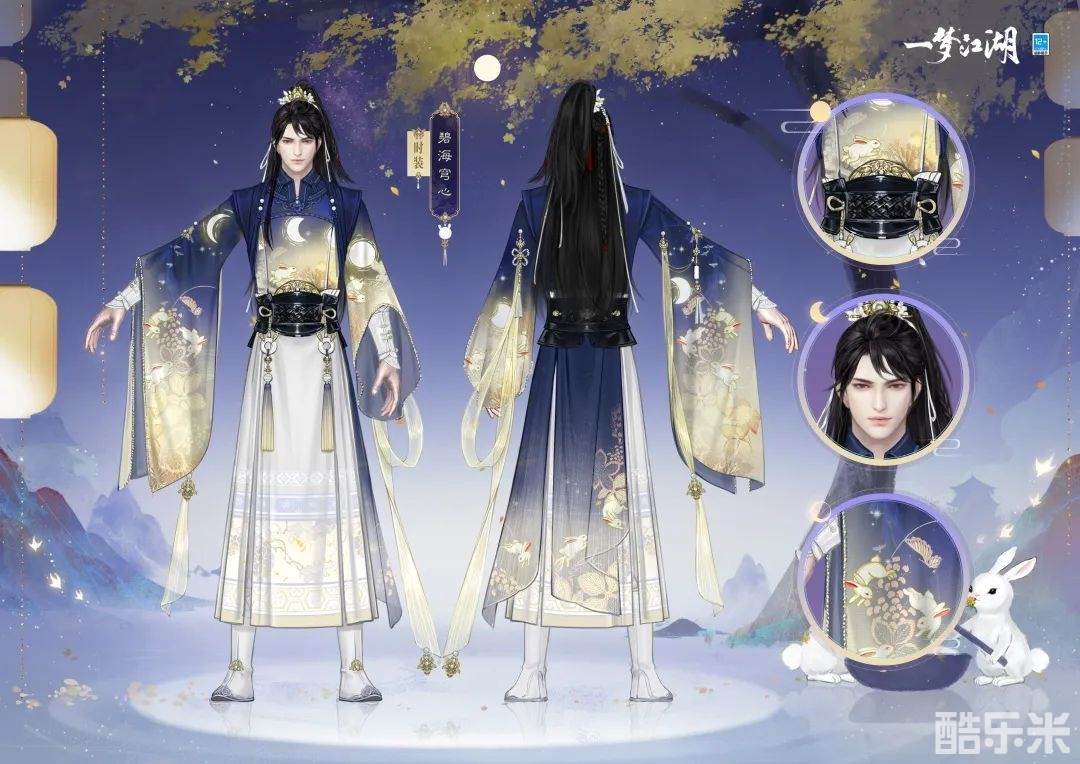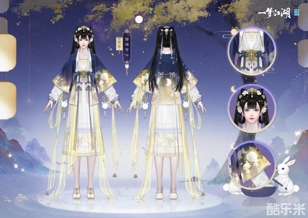 中秋时装·碧海穹心取色于秋夜与盈月,如深空般清冷的幽蓝色与如秋月般温馨的暖黄色相衬,将醉人的良辰美景映入衣袍。《一梦江湖》根据古时中秋服饰传统,设计了不同而又各有风趣的兔子花纹,在这些花纹中,有的兔子奔腾于碧海之上撒欢;有的起舞于庭英飘零的景色;还有的静静伫立,遥望穹心。不同的兔子花纹皆具绝美的意境,呼应着中秋节的祥和之景。