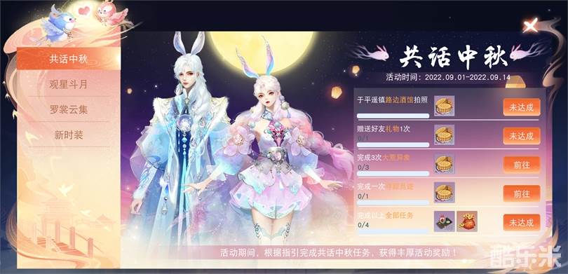 此外,少侠们还可前往共话中秋活动界面,根据指引完成任务,即可获得赏月食材宝箱、桂花酒、金币等丰厚活动奖励~使用桂花酒还可在活动商店兑换雷音溟钻、圣灵软玉等丰富道具!