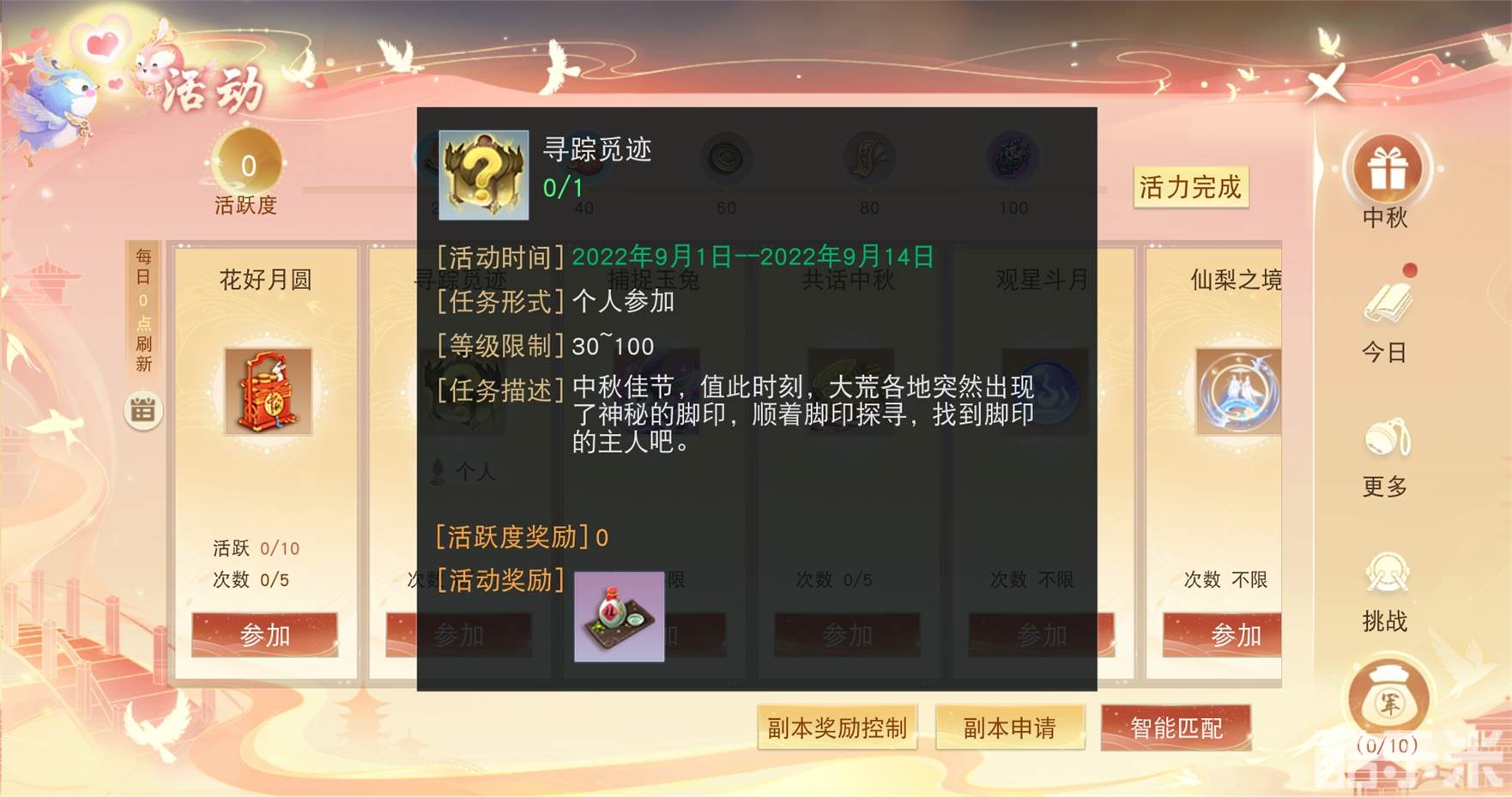中秋将至,萌兽降临大荒!在活动页面点击参与【寻踪觅迹】活动,即可在大荒各处发现神秘踪迹,跟着脚印的朝向找到中秋萌兽并击倒它,便可获得海量经验、金币、桂花酒等奖励!