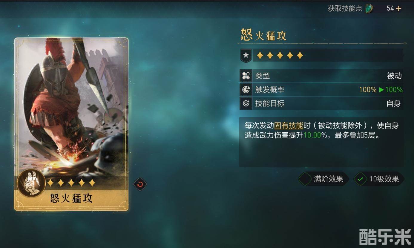 像是主将位列奥尼达,在装配了蛮勇侵袭的情况下,选择怒火猛攻能给包括主将技和固有技在内的三个输出技能增伤,叠满后每个技能提升50%,收益超过其他输出型技能。