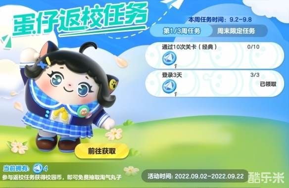 9月2日至9月22日,【蛋仔返校任务】开启。活动期间完成每周任务与周末限定任务,即可获得相应数量的校园币。