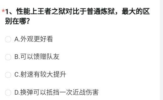 答案解析:题目的选项一共是有四个,分别是A、外观更好看、B、可以馈赠队友、C、射速有较大提升、D、换弹可以抵挡一次近战伤害,这里需要分析什么是王者之狱。