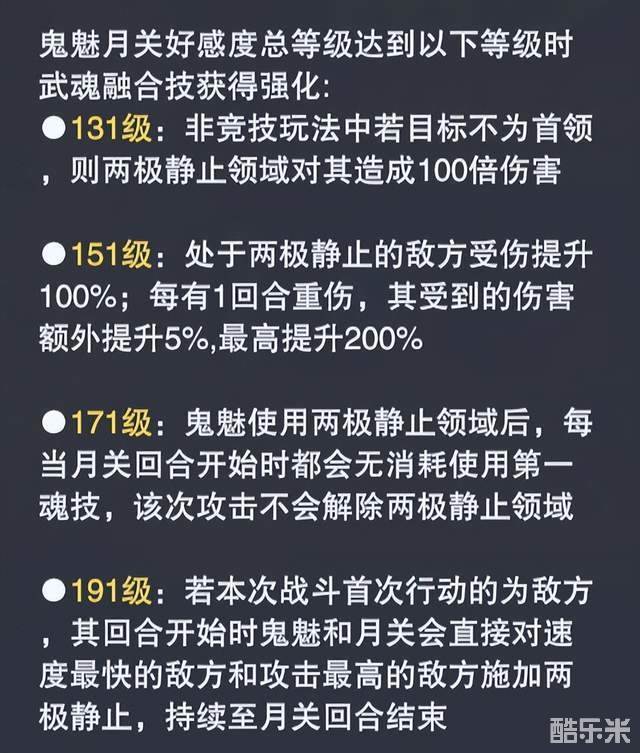11级可对非竞技副本中的非首领目标造成100倍伤害12级可对两极静止中的敌方造成100%的增伤,且对方每有1回合【重伤】则可额外提升5%受伤,最高200%,联系到初始的100%就是合计最高300%的受伤提升13级可提供在鬼魅主导使用武魂融合技后,月关回合开始时他都会无消耗使用1技能来对敌方进行攻击,且该次技能使用并不会打断【两极静止领域】14级可提供战斗中若敌方抢到先手,则其回合开始时菊鬼会对敌方速度最快和攻击最高的两位敌人施加【两极静止】,这个效果持续到月关回合结束