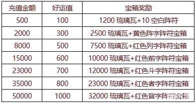 【活动内容】活动期间可通过充值金币获得好运值,积累好运值即可打开宝箱奖励,超多的琉璃瓦,大量的阵符宝箱,绝对超值的提升战力资源,尽在特惠好礼。