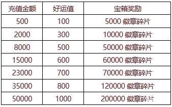【活动内容】活动期间可通过充值金币获得好运值,积累好运值即可打开宝箱奖励,超多的徽章碎片,徽章等级不断攀升,绝对超值的提升战力资源,尽在特惠好礼。