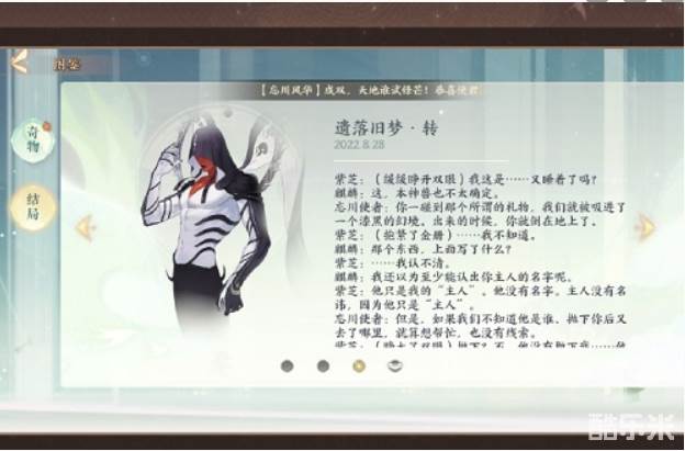 4、“合”:在第四层最后一个问卜点选第一个选项打开佩囊(在此之前至少有六个生效奇物)获得“心字罗衣”。