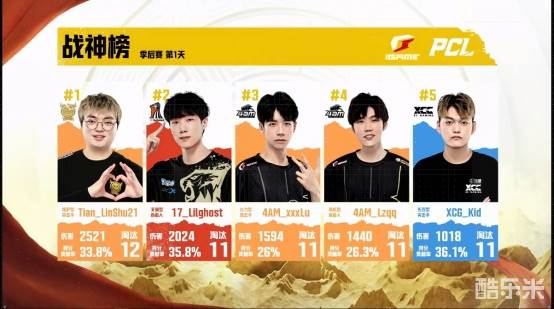 季后赛首日比赛,Tianba战队和4AM战队的战场让人大呼过瘾!4AM战队单日拿下三鸡,并以近四十个淘汰数拿下96分,登上首日的积分榜榜首!队内xxxLu选手和lzqq选手分别以26%和26.3%的得分贡献率稳坐4AM战队功臣宝座。Tianba战队状态火热,二连鸡拿下首日第四,特别是在第三局比赛中Tianba战队单局拿下了十四个淘汰数吃鸡;队内LinShu21选手以惊人的2521伤害值和33.8%的得分贡献率荣登首日战神榜榜首。