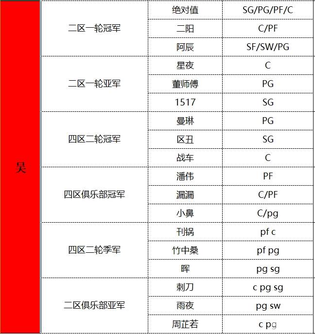 吴国队长绝对值首选星夜,董师傅,可以看出小强想要赢下阵营战的决心,队中有国服最顶尖的几位选手阿辰,二阳,潘伟保证了阵营的硬实力,搭配小鼻和漏漏的顶级双PF阵容以及四区顶尖SG区丑,成熟稳重的日军哥等。整体分析,阵营中双外阵容居多,综合实力是三个阵营中最强的。