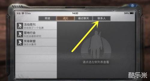 5、此外,在下图页面的上方有频道、通知、最近聊天以及联系人四个功能,玩家也可以点击进入到【联系人】页面来添加好友。
