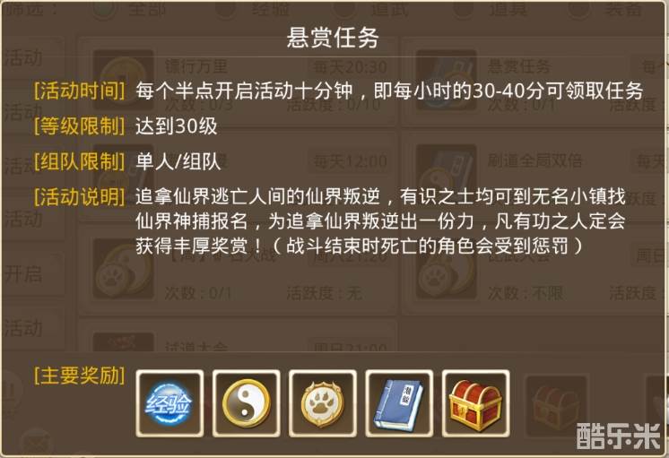 悬赏任务是每个半点开启活动,持续10分钟,可以单人或者组队完成,每人每天最多获得5次悬赏奖励。悬赏活动奖励可以选择道行或者经验,悬赏任务是有死亡惩罚的。