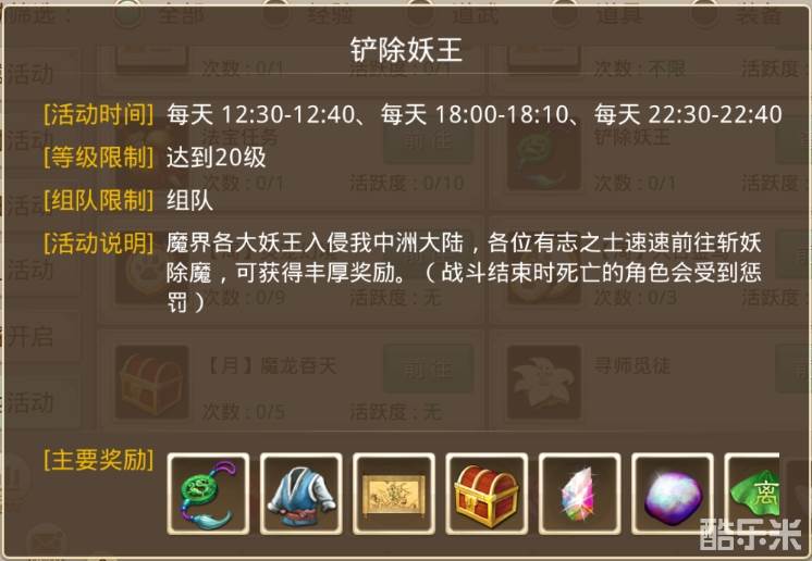 铲除妖王活动每天有3个时间段,每次持续10分钟。杀妖王可以获得首饰、妖石、改造装备道具(超级晶石、超级灵石)以及装备奖励,战斗有死亡惩罚。