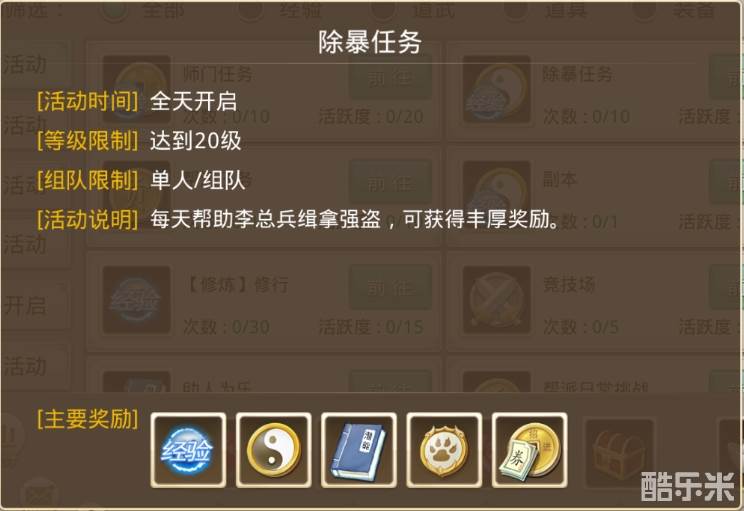 这就是世界常说的1030、40或者13活动,除暴可以单人也可以组队,但是组队获得的奖励更丰厚。除暴可以获得经验道行武学以及金钱奖励。