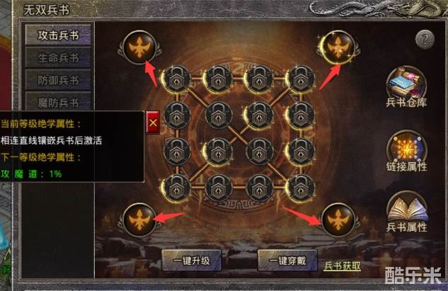 获取的兵书都会存放在兵书绝学NPC的兵书仓库中,在这也可以看到兵书镶嵌后带来的属性加成。